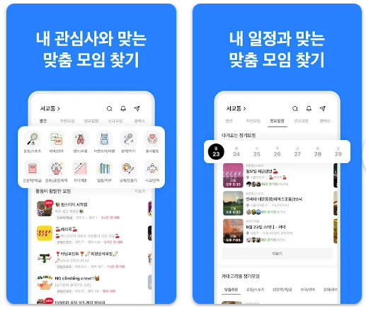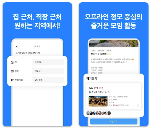 앱은 취미, 관심사, 지역 등을 기준으로 여러 모임을 추천하며, 러닝크루, 독서, 캠핑, 사진, 영화 등 폭넓은 활동을 다룹니다. 많은 사용자들이 새로운 친구를 사귀거나 인맥을 넓히는 데 활용하고 있습니다.
