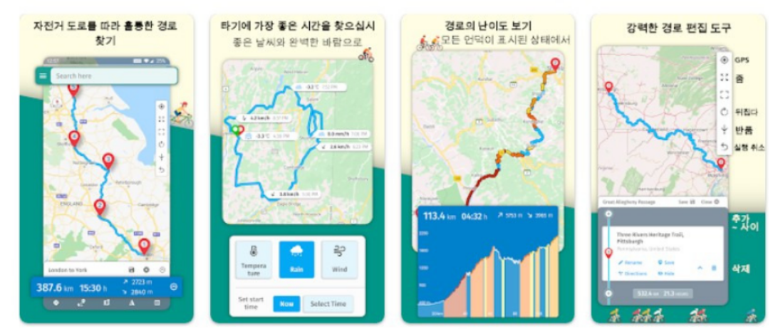 - 경로 안내: 단순 직선 경로뿐 아니라, 자전거 전용 도로나 언덕 정보, 위험 구간 표시 기능이 있는 앱이 유용합니다.