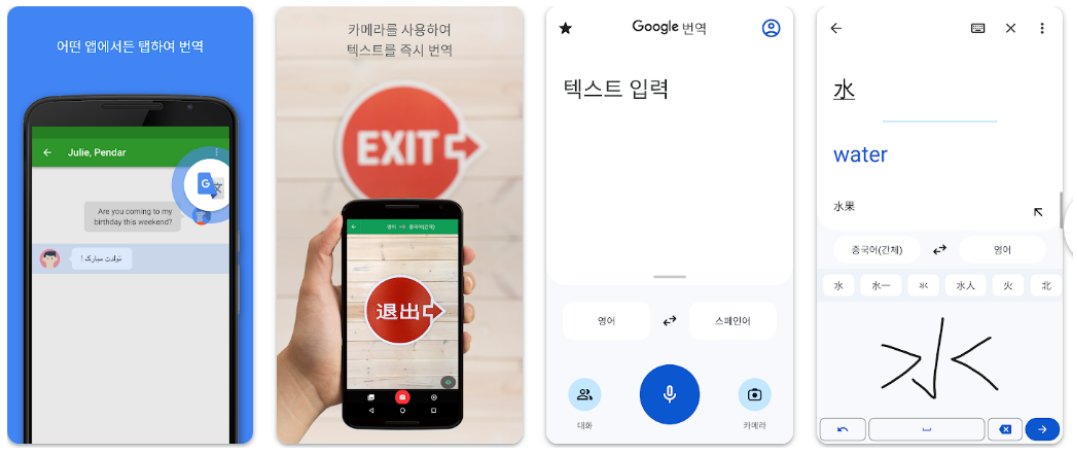 Google 번역은 텍스트 번역뿐 아니라 사진 번역, 실시간 카메라 번역을 함께 제공하는 종합 번역 어플입니다. 전 세계적으로 사용자가 많아 다양한 언어를 지원하는 것이 특징입니다.